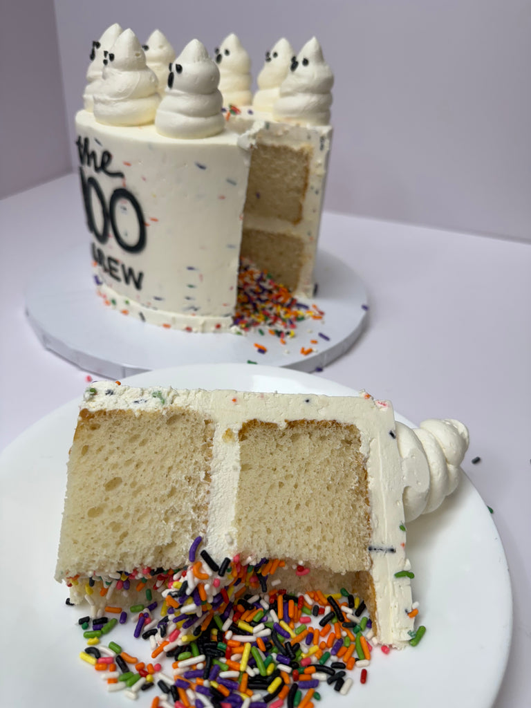 Cut this cake open for FUN Sprinkle surprise! Filled with buttercream and sprinkles, this cake will be sure to be the hit of your Halloween party!